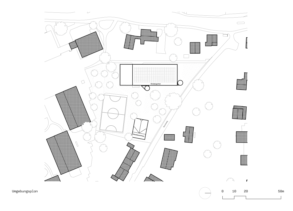 Das Projekt Nussbaumhaus entstand im Zuge des Neubaus Kindergarten und Tagesstruktur Stock auf derselben Parzelle. Obwohl der Abbruch des Gebäudes im Wettbewerbsprogramm vorgesehen war, fiel die Entscheidung zugunsten des Erhalts, um dessen historische und räumliche Präsenz im Ortsbild zu bewahren.