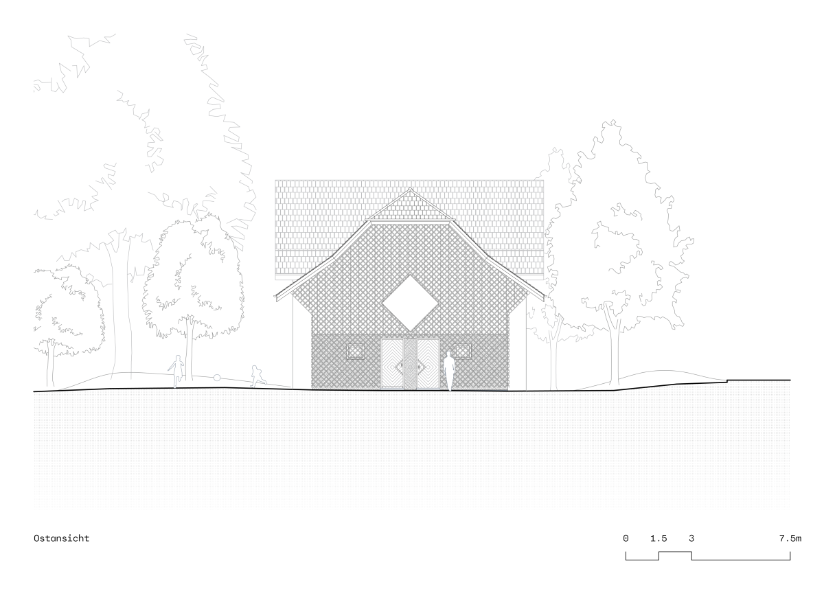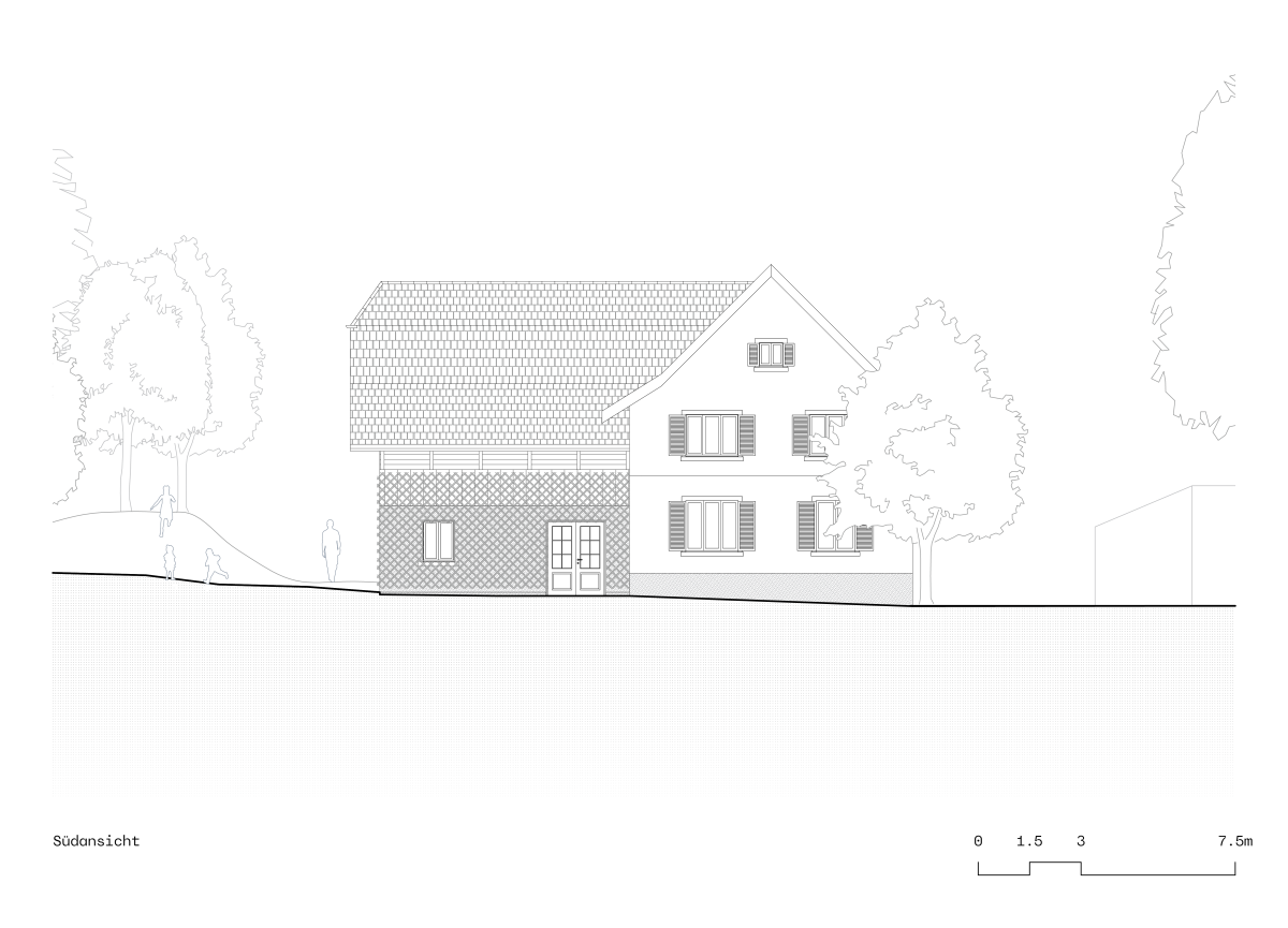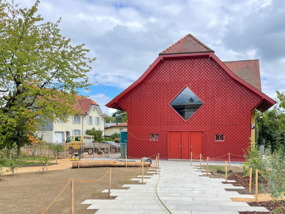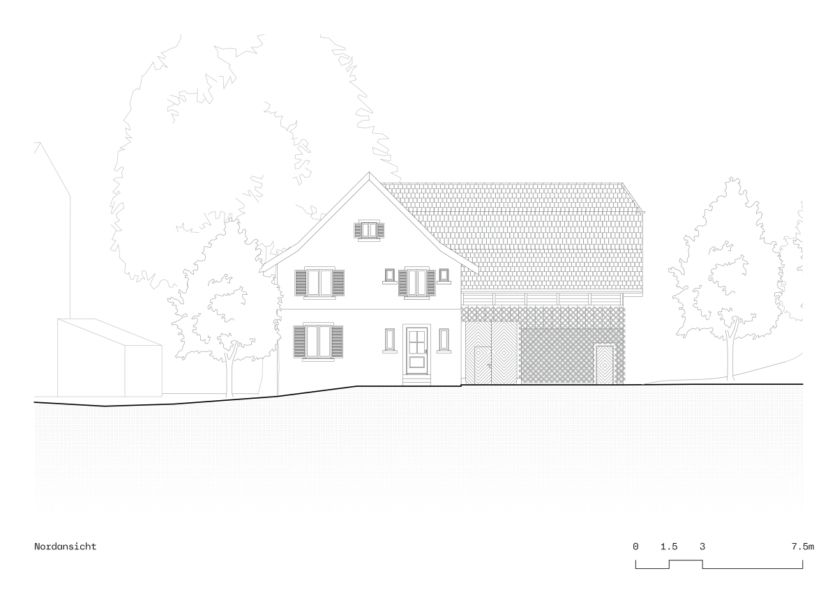 Das Haupthaus wird in den kommenden Jahren von der Gemeinde einer neuen Nutzung zugeführt. Die angrenzende Scheune übernimmt dabei eine wichtige städtebauliche Rolle: Sie bildet das vis-à-vis des Kindergartens und zugleich den räumlichen Abschluss des Aussenspielbereichs.