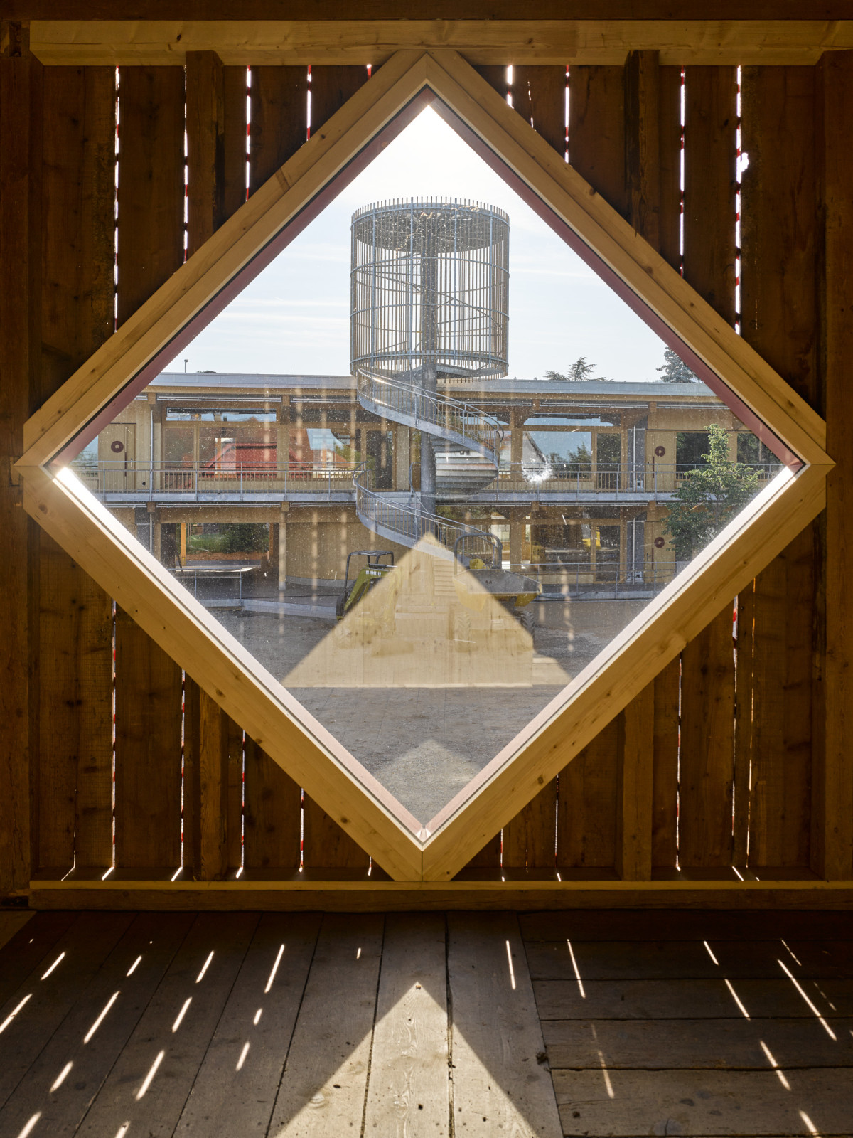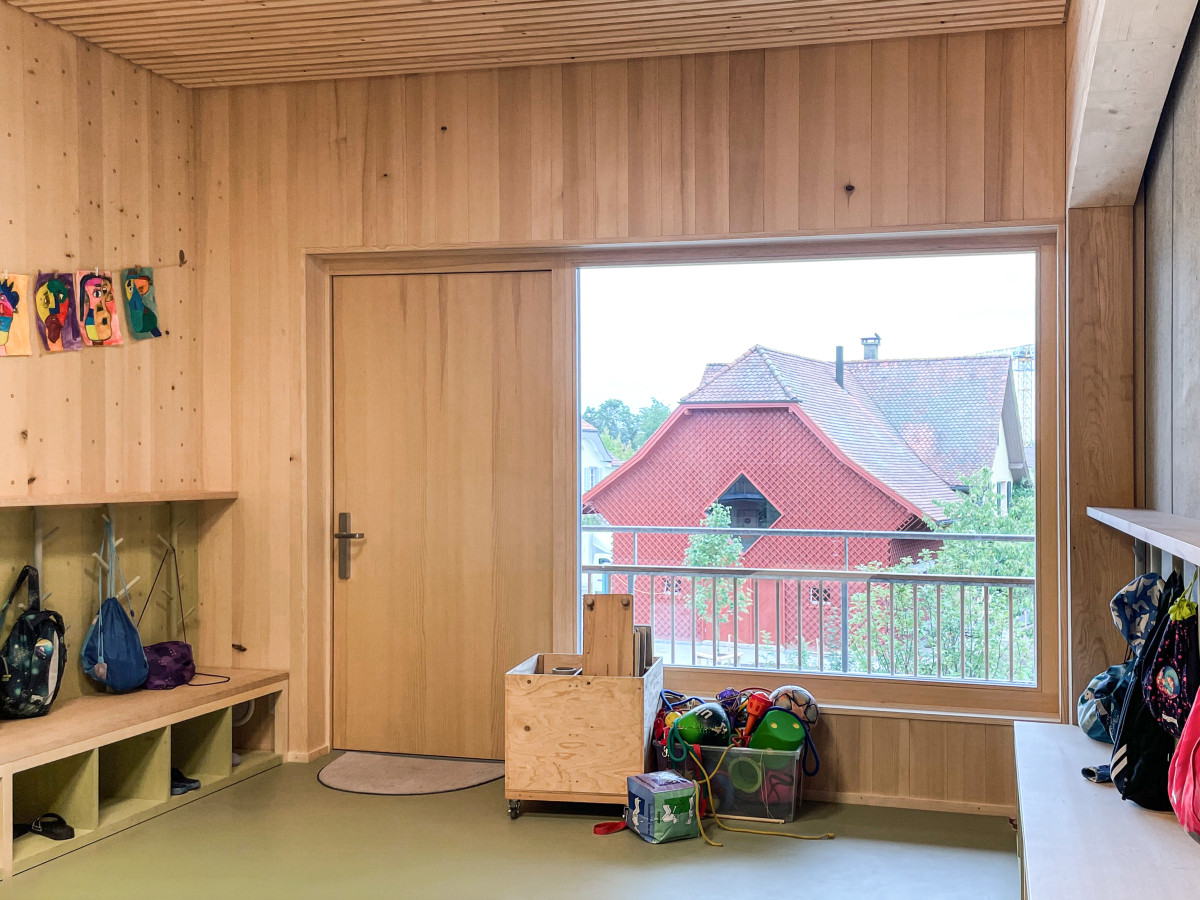 Mit einfachen, gezielten Eingriffen wurde die Fassade technisch saniert und in ihrer Erscheinung so transformiert, dass sie ein harmonisches Ensemble mit dem Kindergarten bildet. Inspiration hierfür boten die bereits am Haus vorhandenen, rautenförmig verlegten Täferstrukturen. Dieses Motiv wurde in verwandter Geometrie als Rankgitter über die gesamte Fassade gespannt. Im oberen Geschoss setzt ein neues, grosszügiges, rautenförmiges Fenster einen klaren Akzent. Es sorgt für die natürliche Belichtung und stärkt zugleich die neue, eindeutige Ausrichtung und Zugehörigkeit des Nussbaumhauses zum Schulareal.