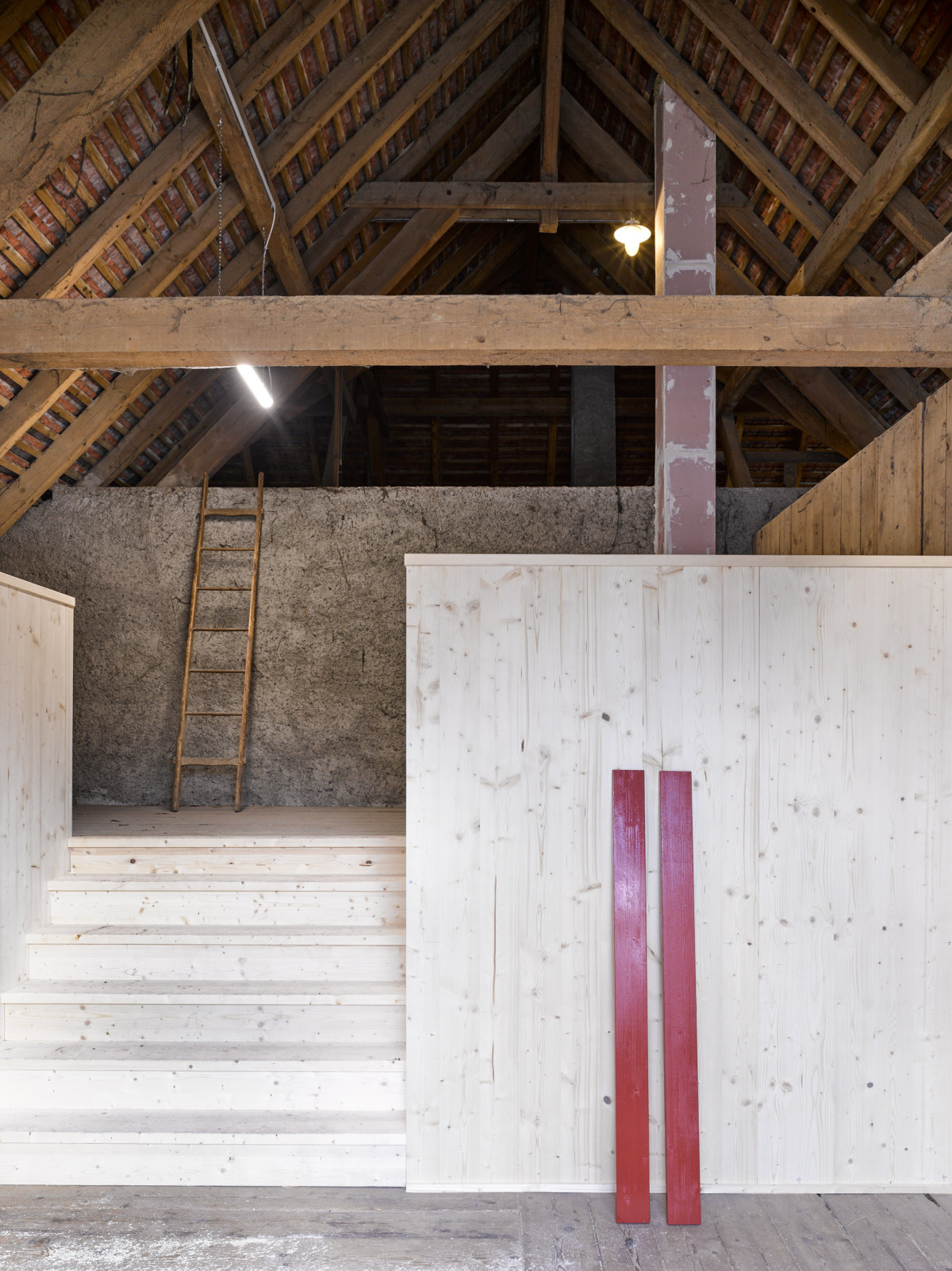 Im Innern blieb die Scheune bewusst in ihrer ursprünglichen Einfachheit erhalten. Lediglich eine sanfte Sanierung sowie der Einbau einzelner Regale ermöglichen nun die Nutzung zur Aufbewahrung der Spielgeräte.