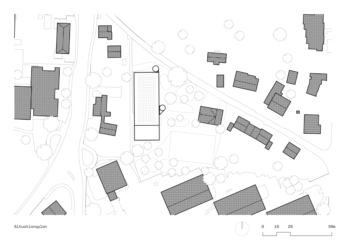 Auf der Südfassade öffnen sich die Räume des Tageshorts zur Schulanlage hin mit Faltschiebefenstern. Diese ermöglichen eine ebenerdige, schwellenlose Benutzung des Innen- mit dem Aussenbereich, sowie eine grosszügige Öffnung des Aufenthaltsraums. Im OG sind drei spezifische Lochfenster geplant, um dem Kopfteil des Gebäudes einen der Nutzung angemessenen Ausdruck zu verleihen.