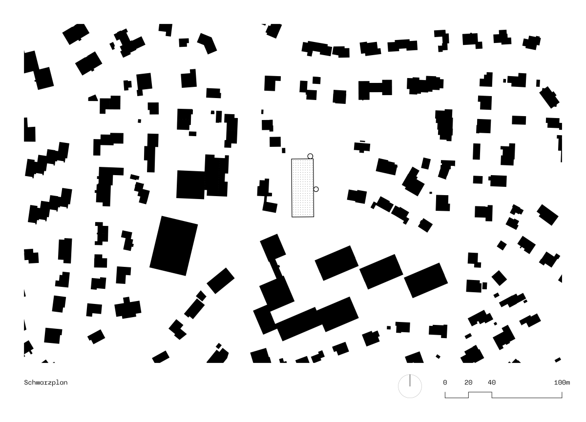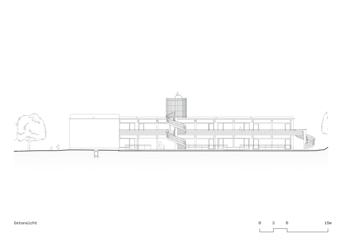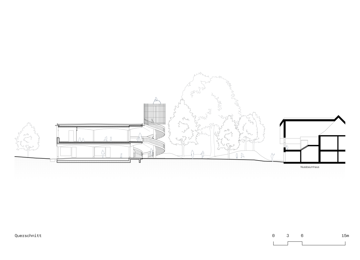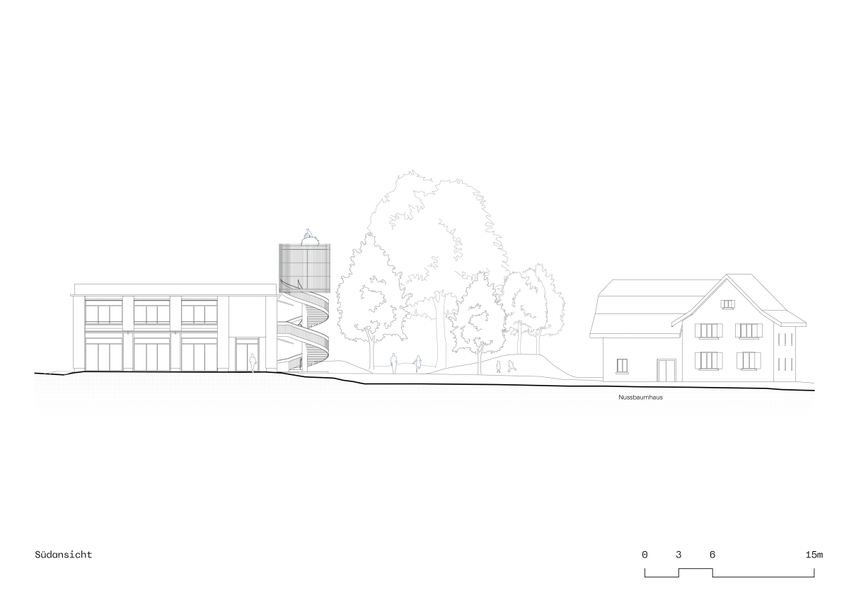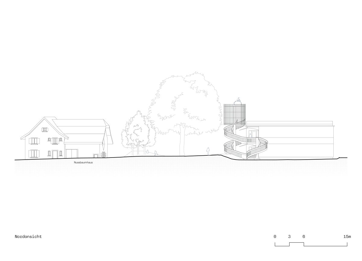 Zwischen der Ostfassade und dem bestehenden Nussbaumhaus spannen sich die unterschiedlichen, der Nutzung durch die Kindergärten vorbehaltenen, Aussenräume auf. Das Nach-Westen-rücken des Kindergartens ermöglicht, dass das Nussbaumhaus erhalten und weiter- bzw. umgenutzt werden kann.