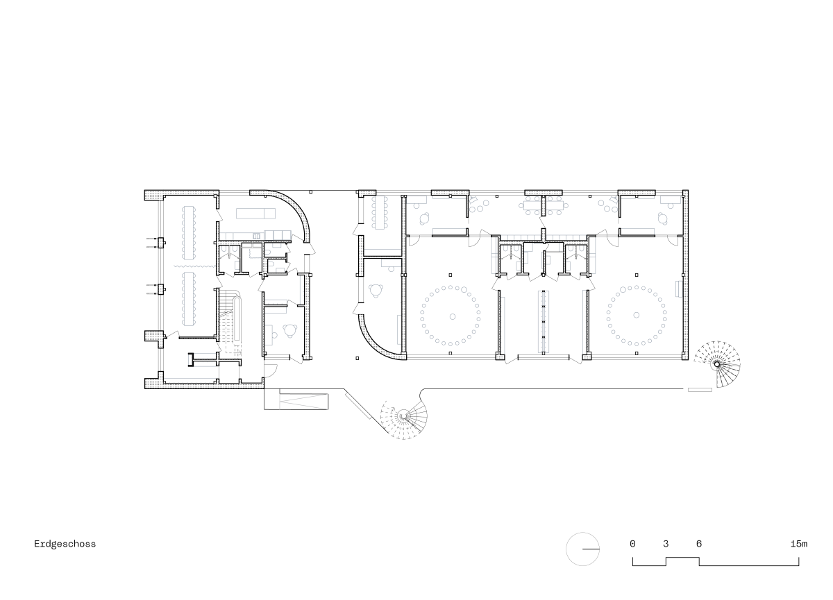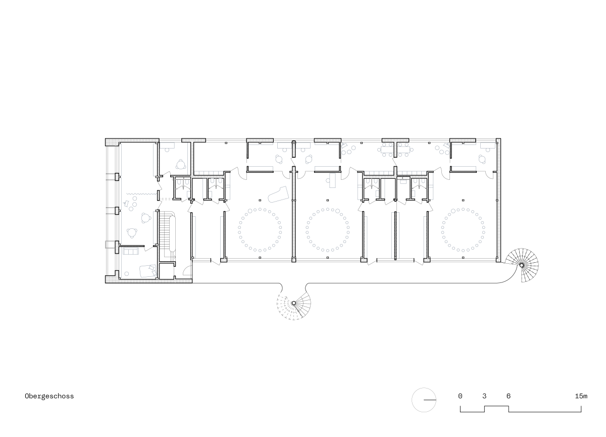 Über die Laube werden die einzelnen Kindergarteneinheiten erschlossen. Von den Garderoben gelangt man in die Haupträume der Kindergärten, sowie in die geteilten WC-Anlagen.