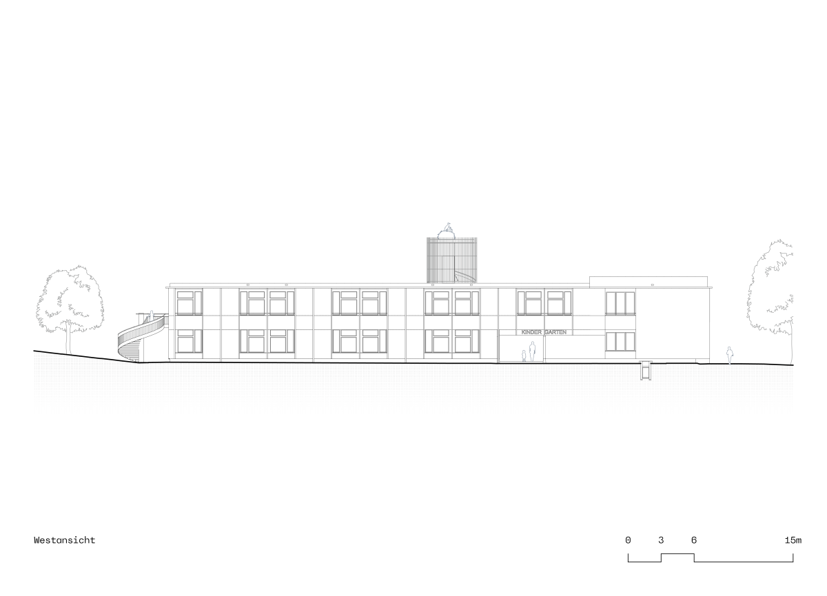 An der Westfassade sind die Gruppen-, Material- und Arbeitsräume als Rücken angeordnet. Die Kindergarteneinheiten erhalten bei Bedarf eine interne Verbindung mittels einer Enfilade; diese ermöglicht die Bewegungen entlang der Westfassade durch die Räume und fördert den Austausch zwischen den Lehrpersonen. Von den Haupträumen der Kindergärten kann jeweils auch direkt die Laube betreten und erlebt werden.