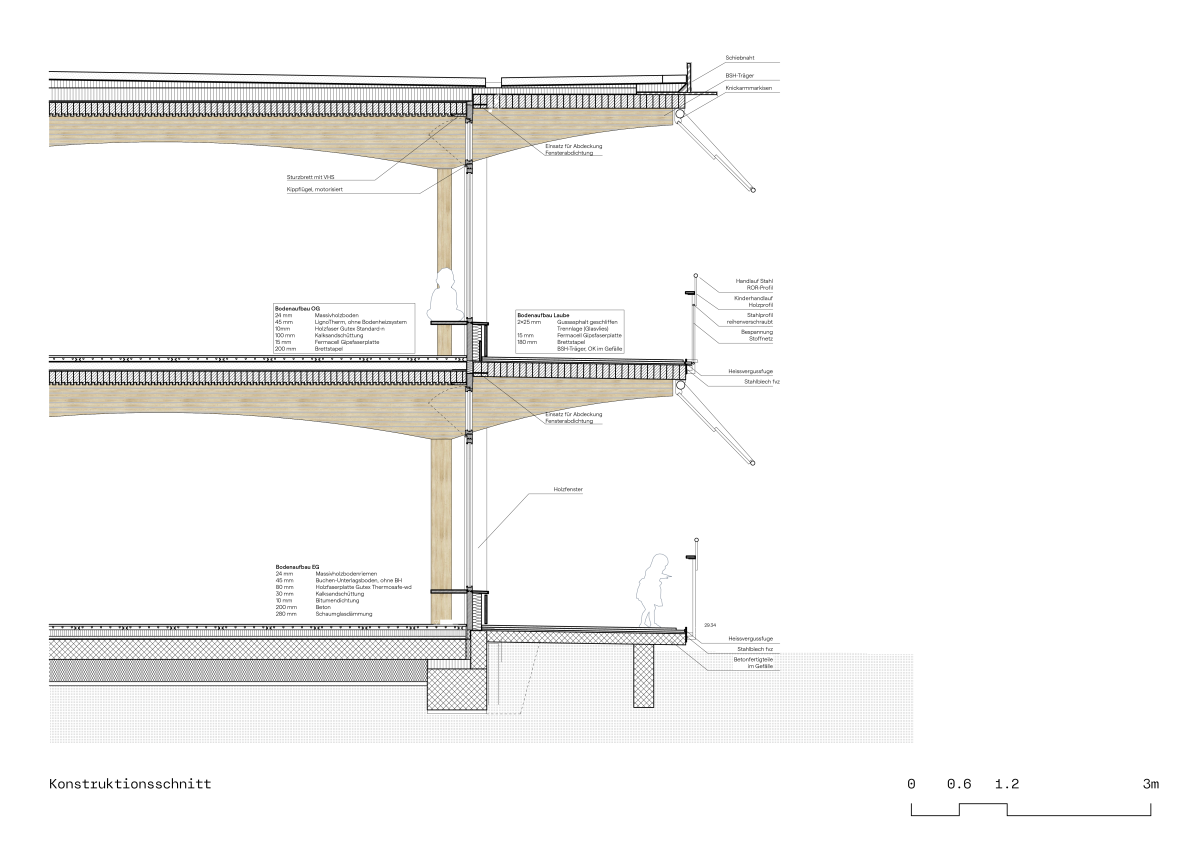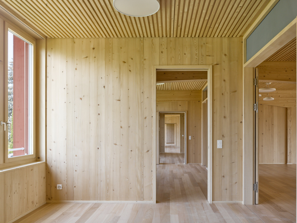Nebst dem innovativen Vollholzsystem wird auch ein Holzunterlagsbodensystem aus regionalem Buchenholz verwendet, welches als Alternative zu konventionellem Zementboden verlegt wird. Somit wird auch beim Bodenaufbau vollumfänglich auf natürliche Materialien gesetzt. Türen, Schränke und diverse andere Möbel werden leimfrei hergestellt. Statt Leim werden Holzdübel oder spezielle Holzverbindungen verwendet, welche die Holzbretter zusammenhalten.