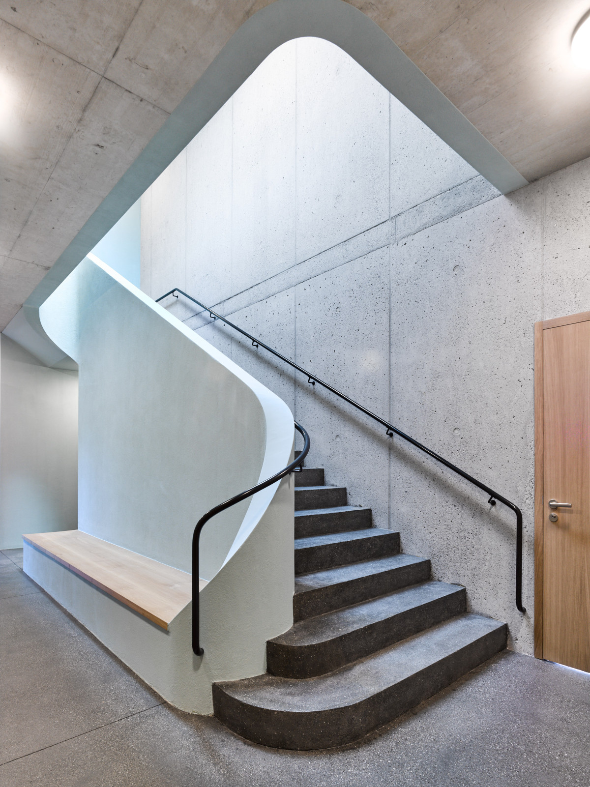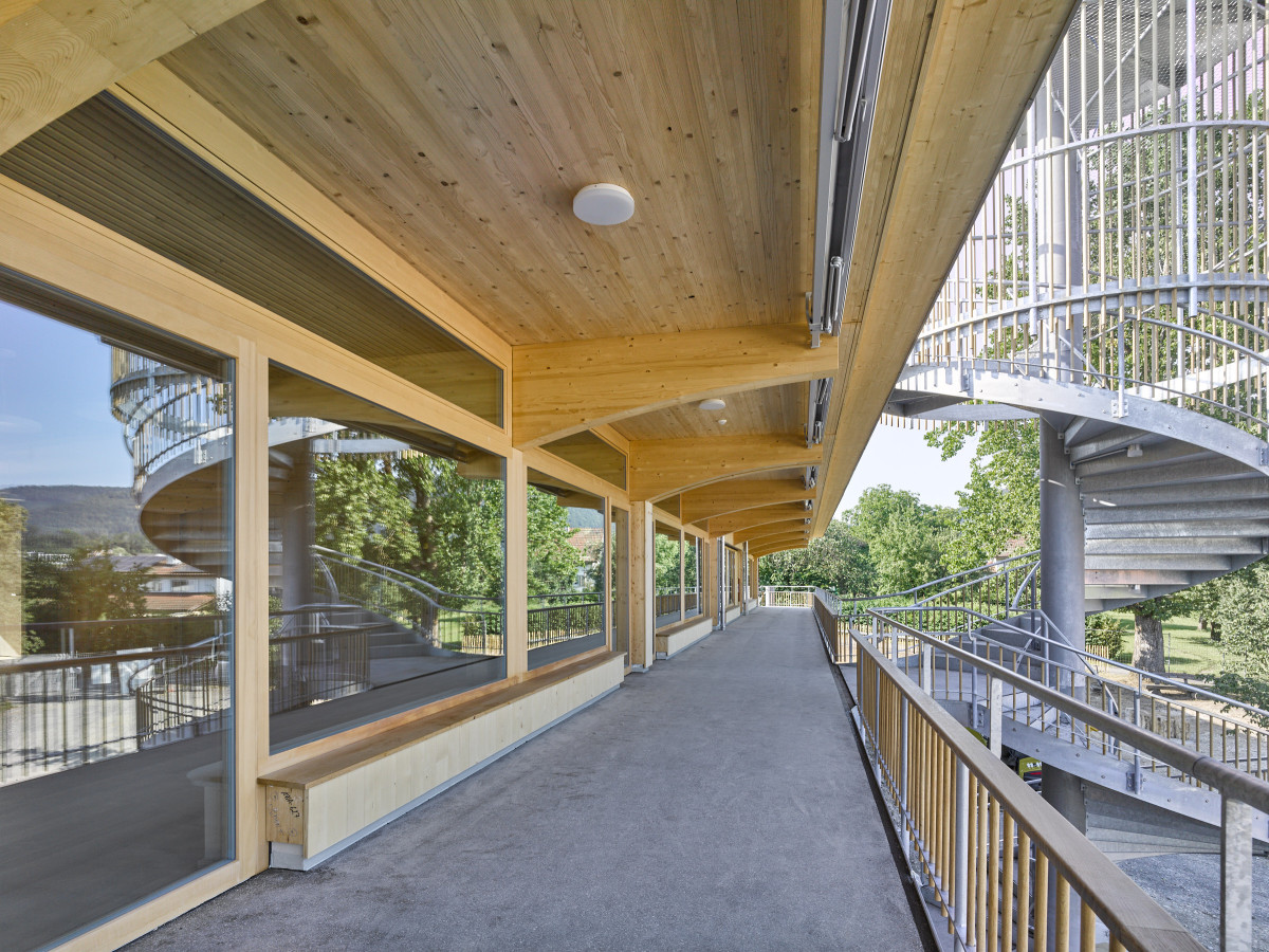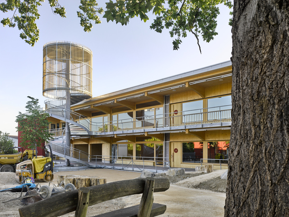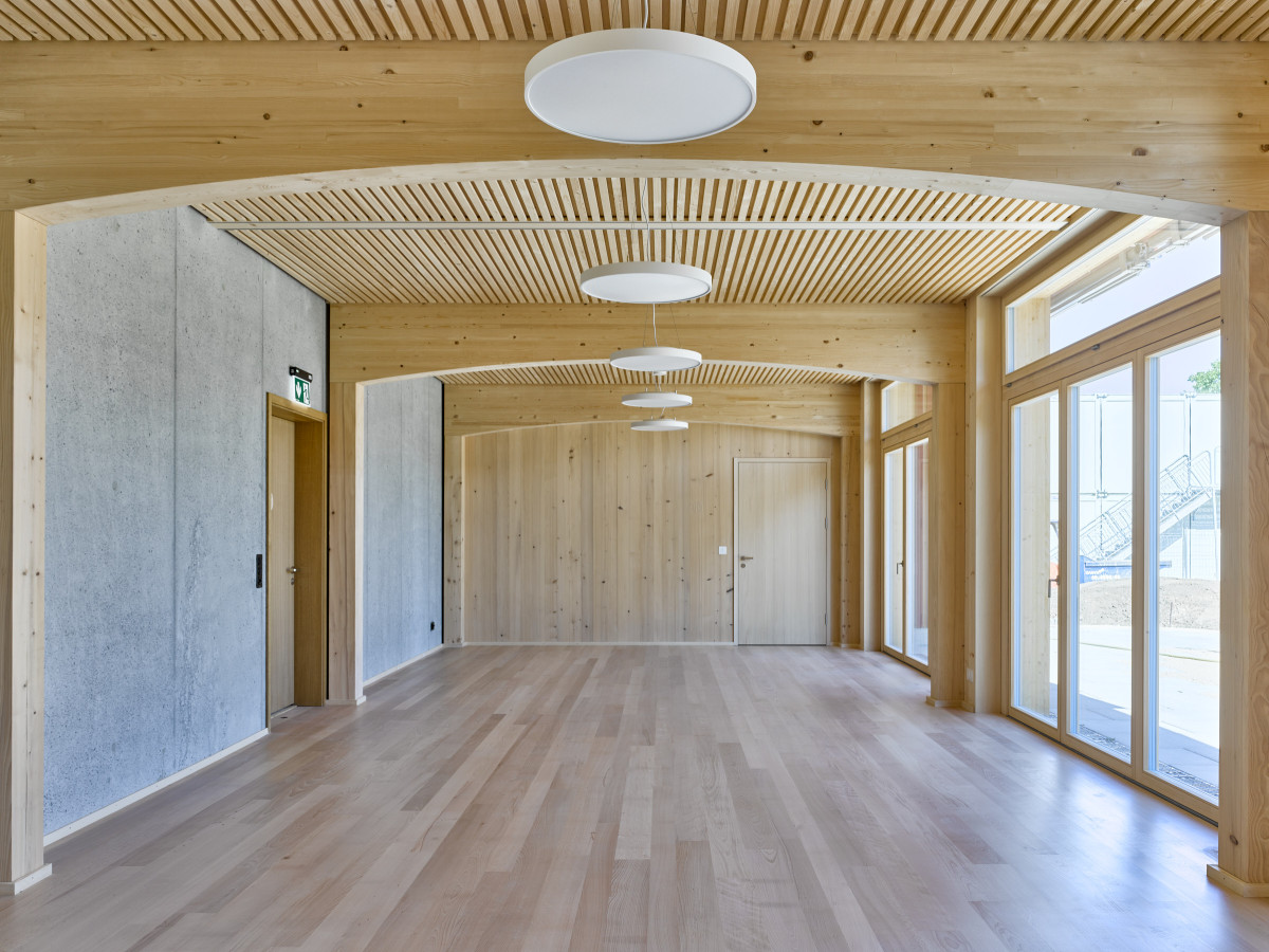 Im Süden des Hauses bildet ein markanter Kopfbau den Abschluss zum Schulareal. Einbeschrieben in diesen Kopfbau liegt die zwischen der Schule und dem Kindergarten geteilte Nutzung – die Tagesstruktur. Zugänglich ist die Tagesstruktur direkt vom Schulareal über einen von der Schule und der Tagesstruktur nutzbaren Platzbereich, sowie einen direkten internen Zugang vom Kindergarten her.