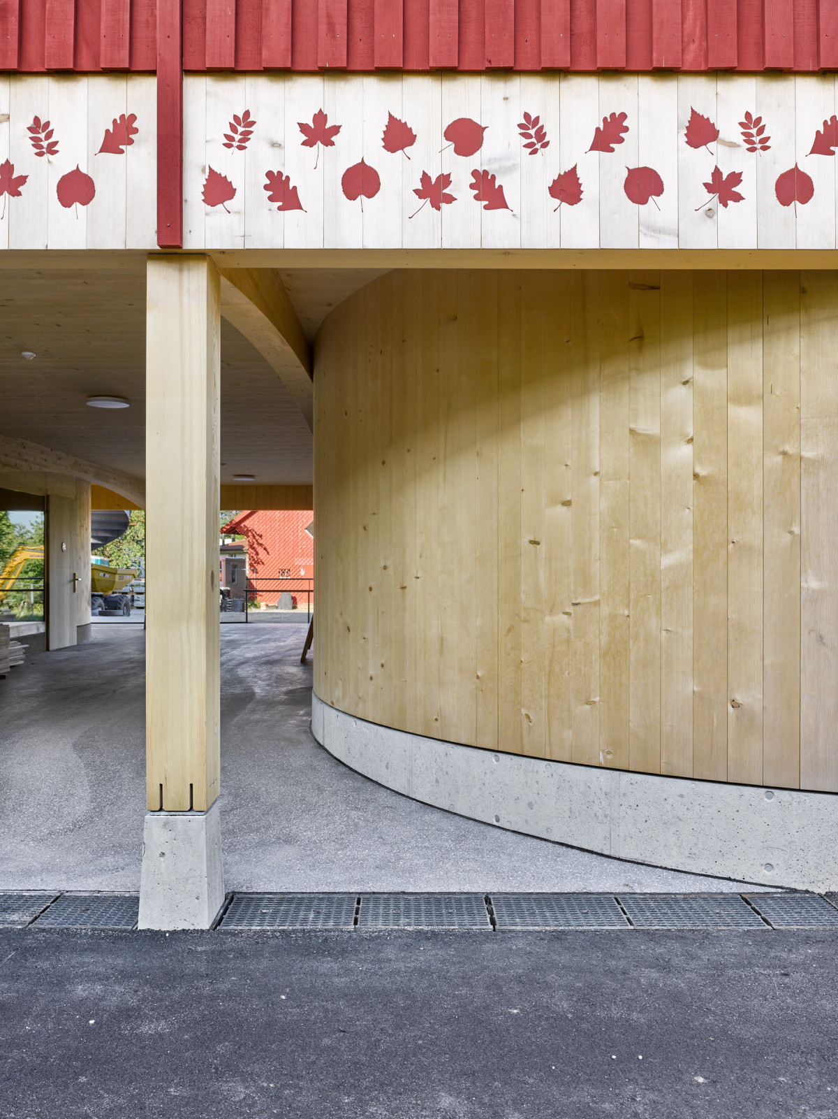 Die Fichtenholzverkleidung ist an den bewitterten Stellen mit einem Anstrich aus roter Schlammfarbe behandelt. Bei den witterungsgeschützten Fassaden der Laube und des Durchgangs wird das Fichtenholz unbehandelt belassen. Dadurch ergibt sich eine umschliessende Geste aus rotem Fichtenholz mit weichem, naturbelassenen Innern, welche auf eine verspielte Art die Sinne der Kinder anspricht.