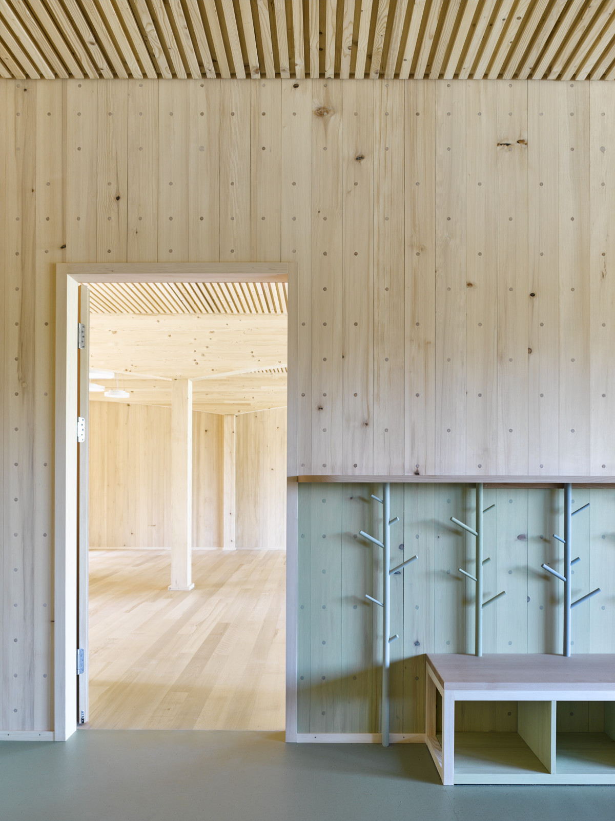 Im Süden des Gebäudes sind die Räume des Kinderhorts über zwei Geschosse organisiert. Im Erdgeschoss befindet sich die Garderobe und der Aufenthaltsraum. Über eine innenliegende Treppe werden die Spielräume, sowie der Ruheraum im Obergeschoss direkt erschlossen.