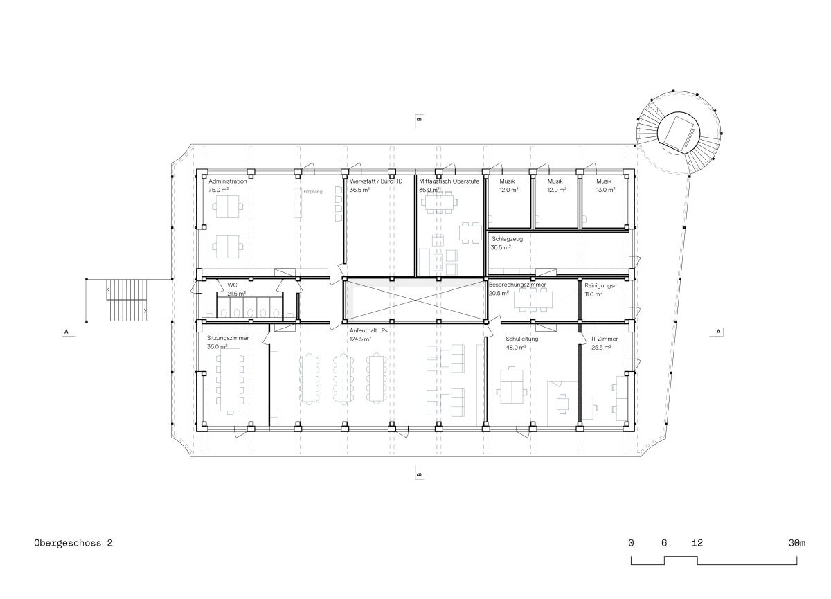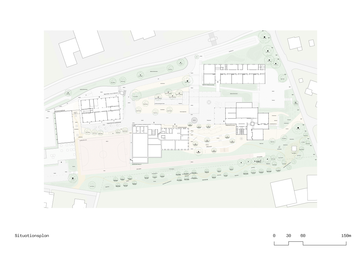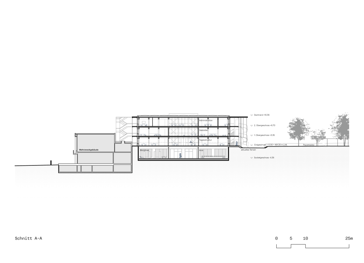 Im erdberührten Sockelgeschoss befinden sich die öffentlichen Nutzungen wie die Aula und die Bibliothek. Ein Geschoss darüber ist die Tagesstruktur untergebracht. Sie ist direkt vom Pausenplatz aus erreichbar und verfügt über einen vorgelagerten Aussenraum, der eine eigenständige, altersgerechte Nutzung ermöglicht. Über der Begegnungszone der Tagesstruktur eröffnet sich der zentral gelegene Lichthof. Das darüberliegende Geschoss ist den Werkräumen vorbehalten. Das oberste Geschoss teilt sich der Lehrer- und Verwaltungsbereich mit den Musikräumen. Ein zentraler Lichthof durchdringt alle Geschosse und dient sowohl der natürlichen Belichtung als auch der vertikalen räumlichen Sicht-Verbindung.