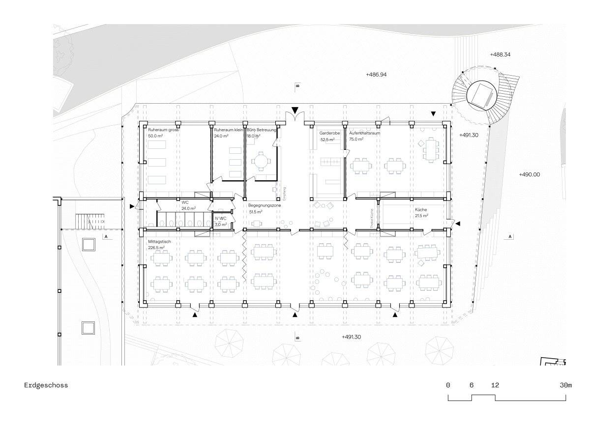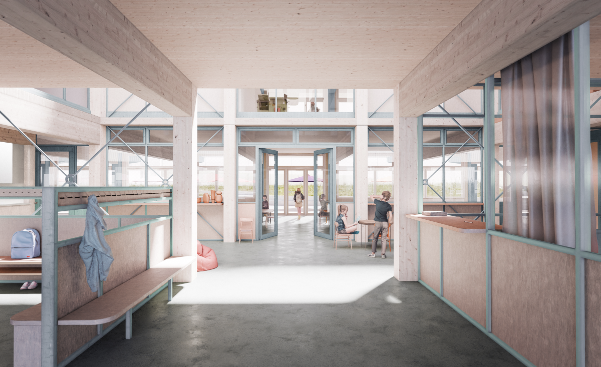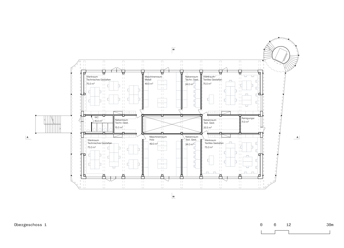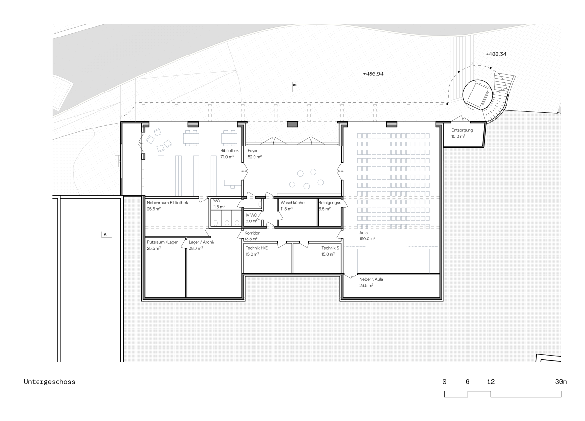 Im erdberührten Sockelgeschoss befinden sich die öffentlichen Nutzungen wie die Aula und die Bibliothek. Ein Geschoss darüber ist die Tagesstruktur untergebracht. Sie ist direkt vom Pausenplatz aus erreichbar und verfügt über einen vorgelagerten Aussenraum, der eine eigenständige, altersgerechte Nutzung ermöglicht. Über der Begegnungszone der Tagesstruktur eröffnet sich der zentral gelegene Lichthof. Das darüberliegende Geschoss ist den Werkräumen vorbehalten. Das oberste Geschoss teilt sich der Lehrer- und Verwaltungsbereich mit den Musikräumen. Ein zentraler Lichthof durchdringt alle Geschosse und dient sowohl der natürlichen Belichtung als auch der vertikalen räumlichen Sicht-Verbindung.