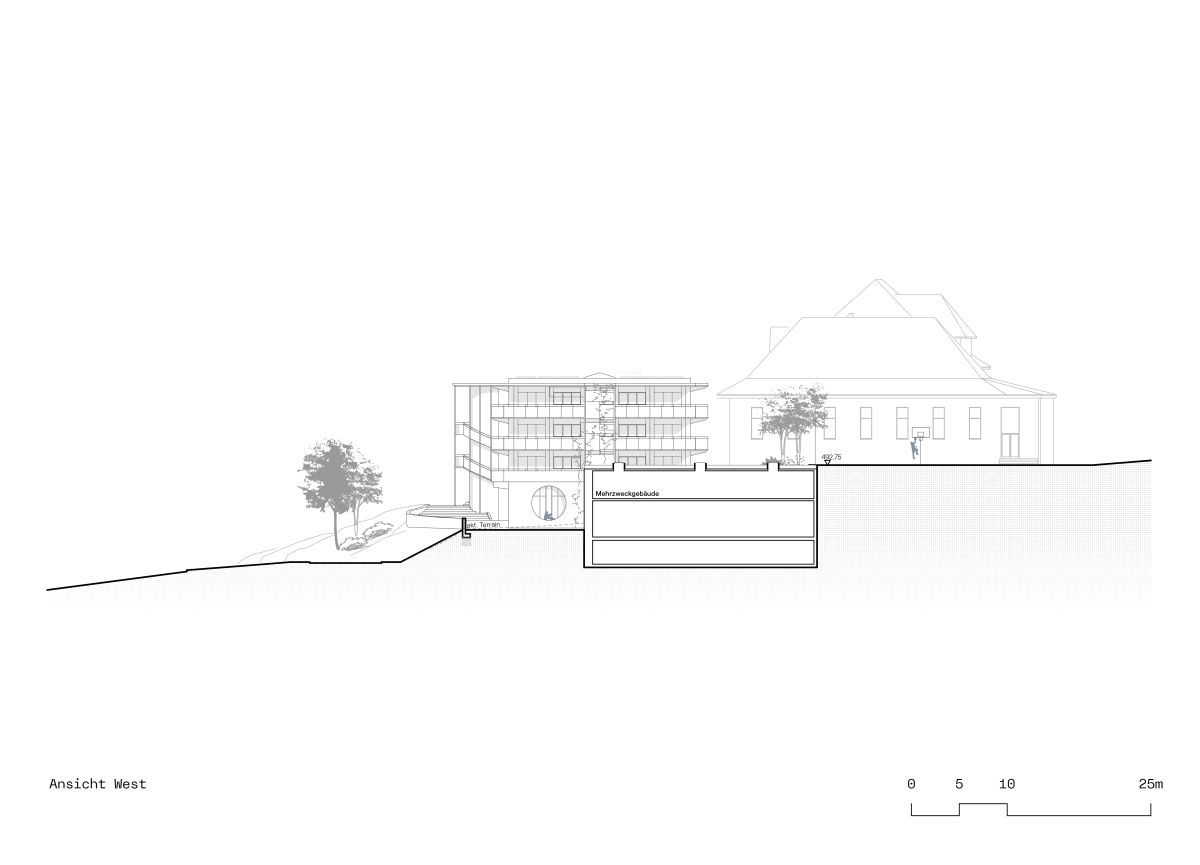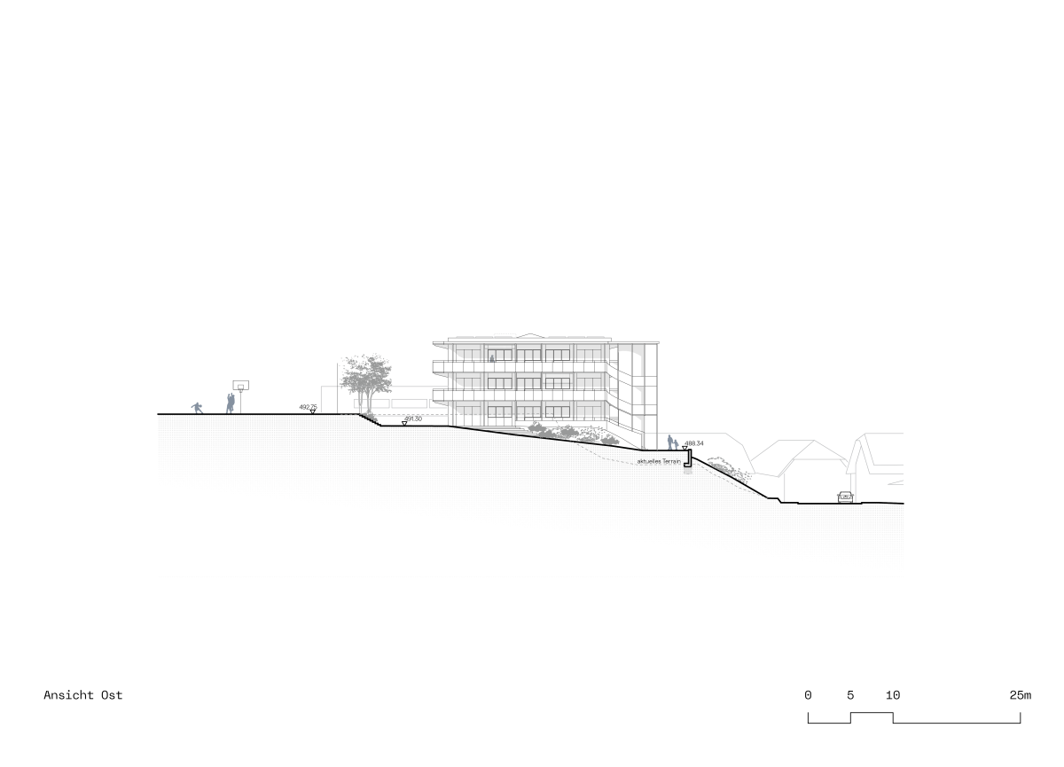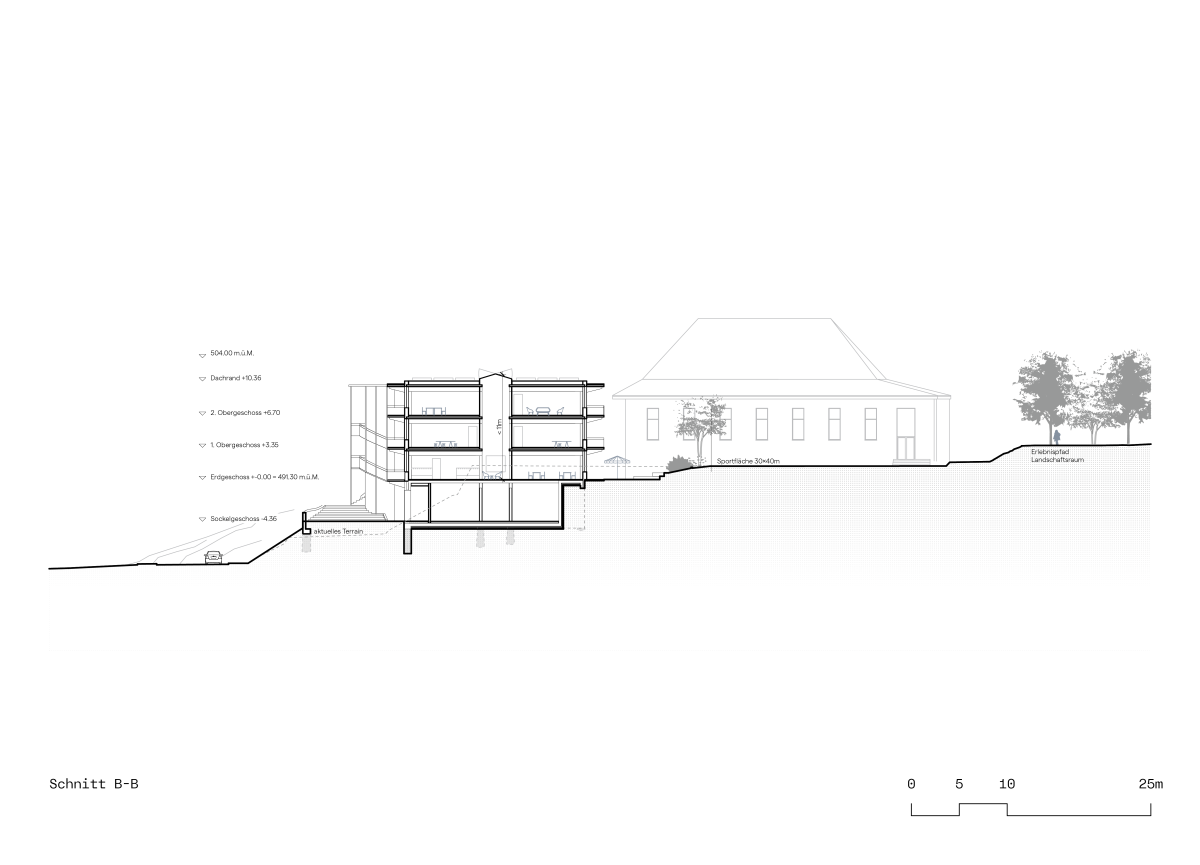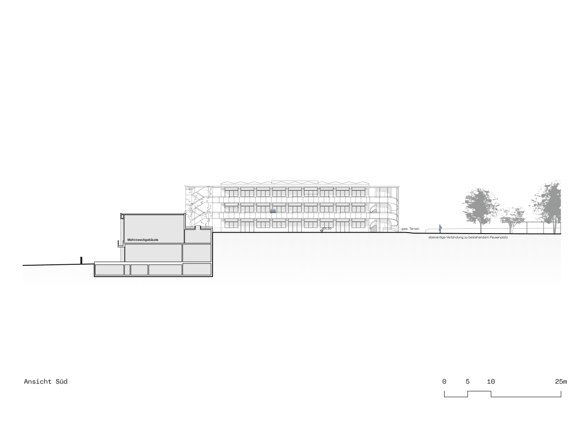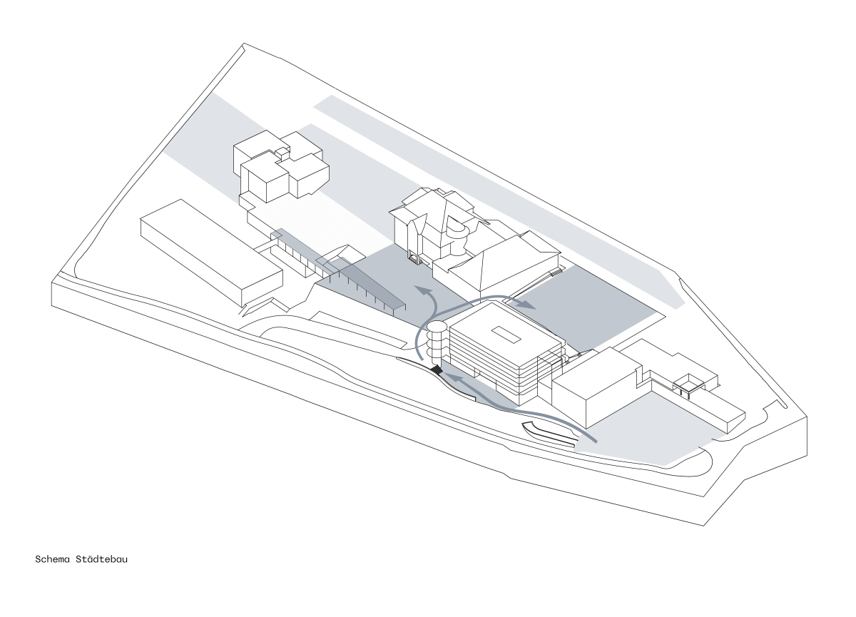 Das neue Schulgebäude ergänzt die bestehende Reihung der Schulbauten und schafft eine klare Abfolge zugeordneter Außenräume, die Orientierung und Identifikation fördern. Durch die Platzierung am hangbegleitenden Weg wird die Adressbildung des Schulareals gestärkt. Ein außenliegender Treppenturm mit einen Lift im Kern vermittelt zwischen den Geländeniveaus und ermöglicht einen barrierefreien Zugang, der Werkhof, Elterntaxi-Zonen und Parkplätze miteinander verbindet. Die Wegführung führt vom Werkhof entlang der Hangkante zu einem neu gestalteten Platz, der Aula und Bibliothek zugeordnet ist und als Treffpunkt dient. Eine großzügige Freitreppe verbindet diesen Platz mit dem Strassenniveau und dem Pausenplatz.