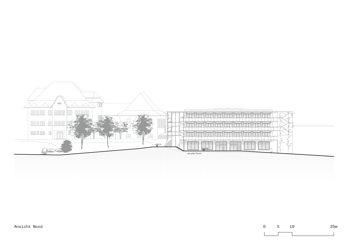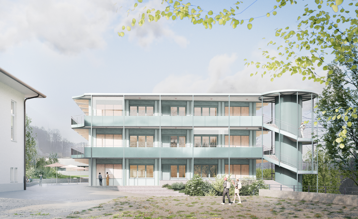 Für das neue Schulhaus wird eine Laubengangtypologie vorgeschlagen, die sich sowohl funktional als auch architektonisch prägend in das bestehende Schulareal einfügt. Der gewählte Typus erlaubt eine klare, effiziente Erschliessung der verschiedenen Nutzungsbereiche und bietet gleichzeitig eine Reihe signifikanter Mehrwerte für das Gebäude und seine Umgebung.