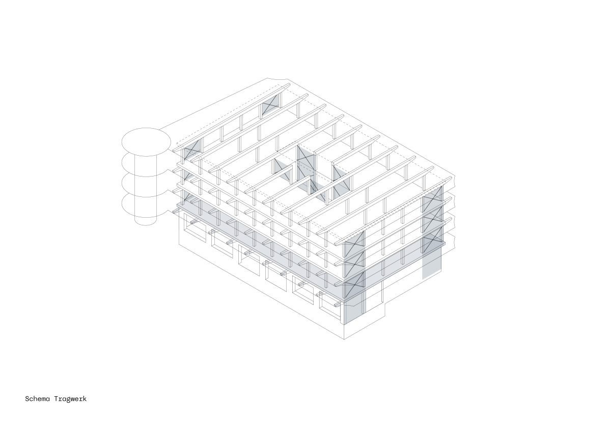 Die Typologie der gewählten Tragkonstruktion verbindet traditionellen Holzbau mit einer modernen, technisch anspruchsvollen Umsetzung, unter Verwendung nachhaltiger Materialien und einer effizienten Bauweise. Ein hoher Vorfertigungsgrad sowie einfache, präzise Verbindungen gewährleisten eine hohe Ausführungsqualität. Im Innenbereich erfolgt der vertikale Lastabtrag über konsequent übereinanderliegende Stützen. Die im Werk vorgefertigten Brettstapelholzdecken sind so optimiert, dass sie alle statischen, bauphysikalischen und brandschutztechnischen Anforderungen erfüllen. Das Untergeschoss wird in Massivbauweise ausgeführt. Der Lastabtrag des darüberliegenden Stützenrasters erfolgt überwiegend direkt über die zahlreichen Aussen- und Innenwände.