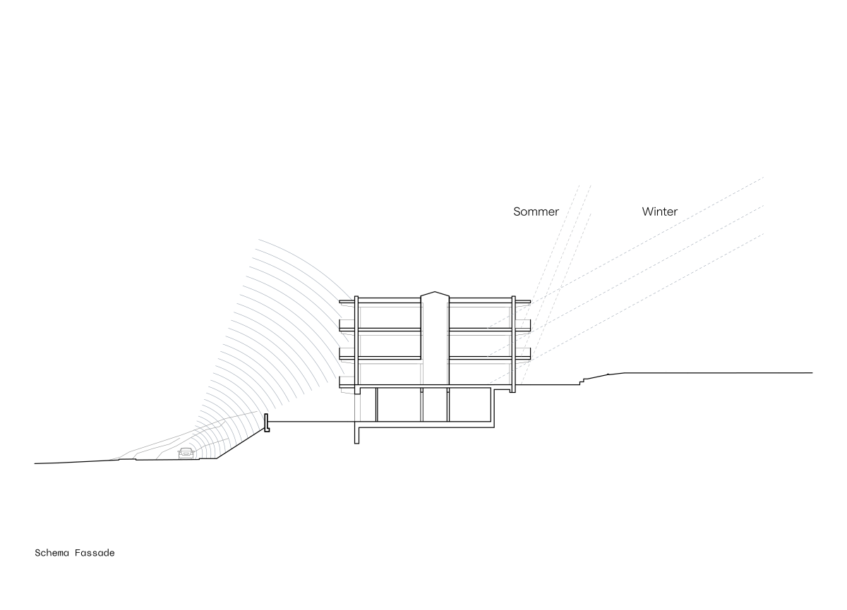 Der Entwurf verfolgt den Grundsatz, die haustechnischen Anlagen auf ein sinnvolles Minimum zu reduzieren und gleichzeitig ein hohes Mass an Raumkomfort sicherzustellen. Dabei steht eine klimatisch robuste Architektur im Vordergrund, die durch passive Strategien wie natürliche Belüftung, Nachtauskühlung und thermische Trägheit der Baumaterialien unterstützt wird.