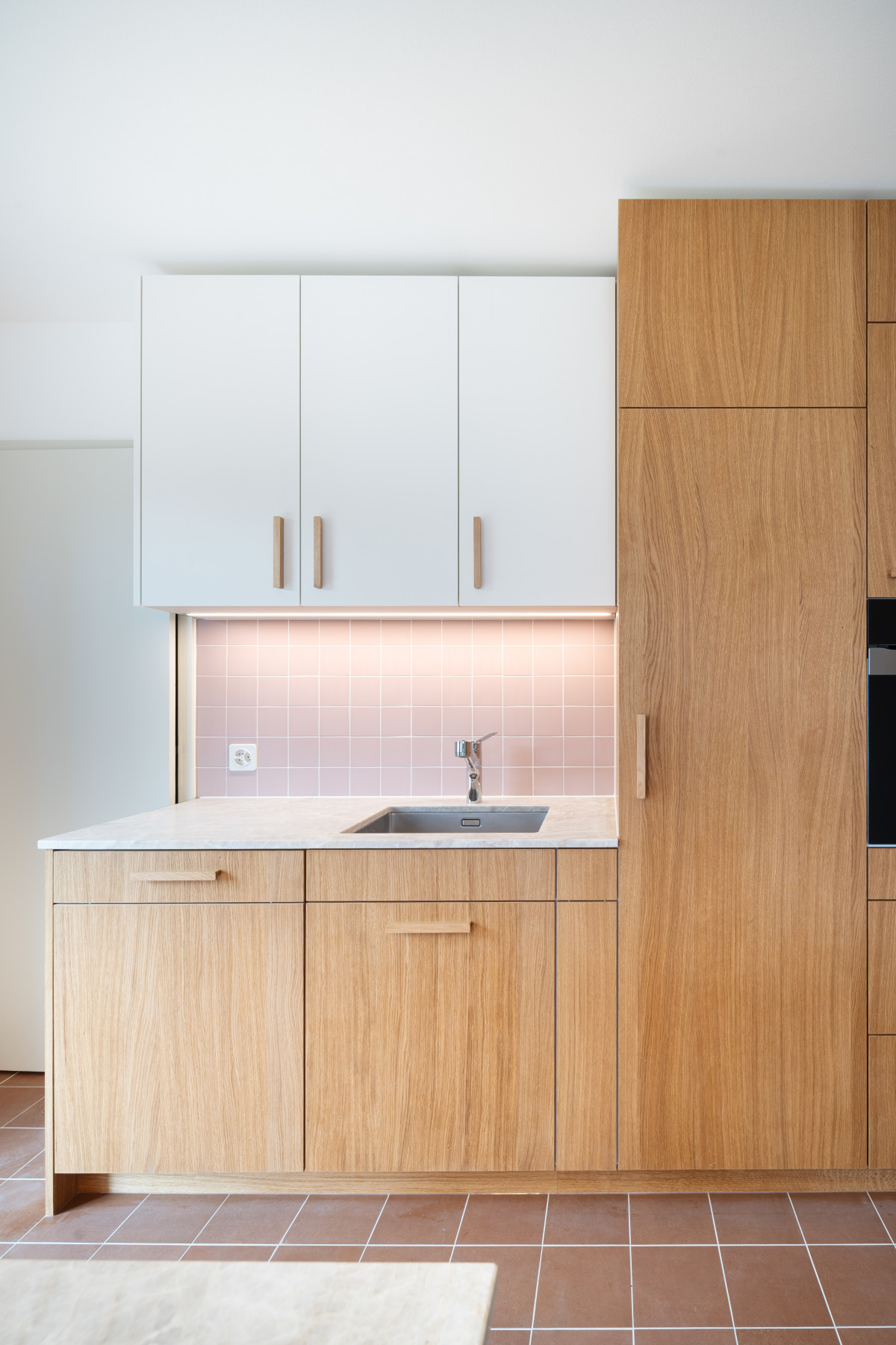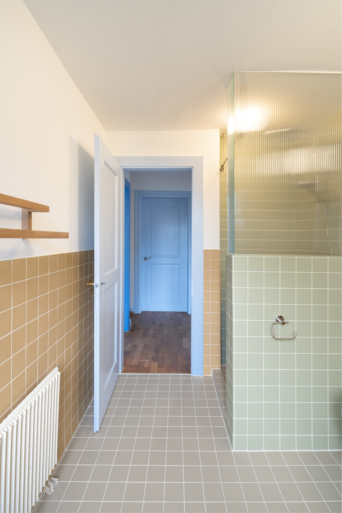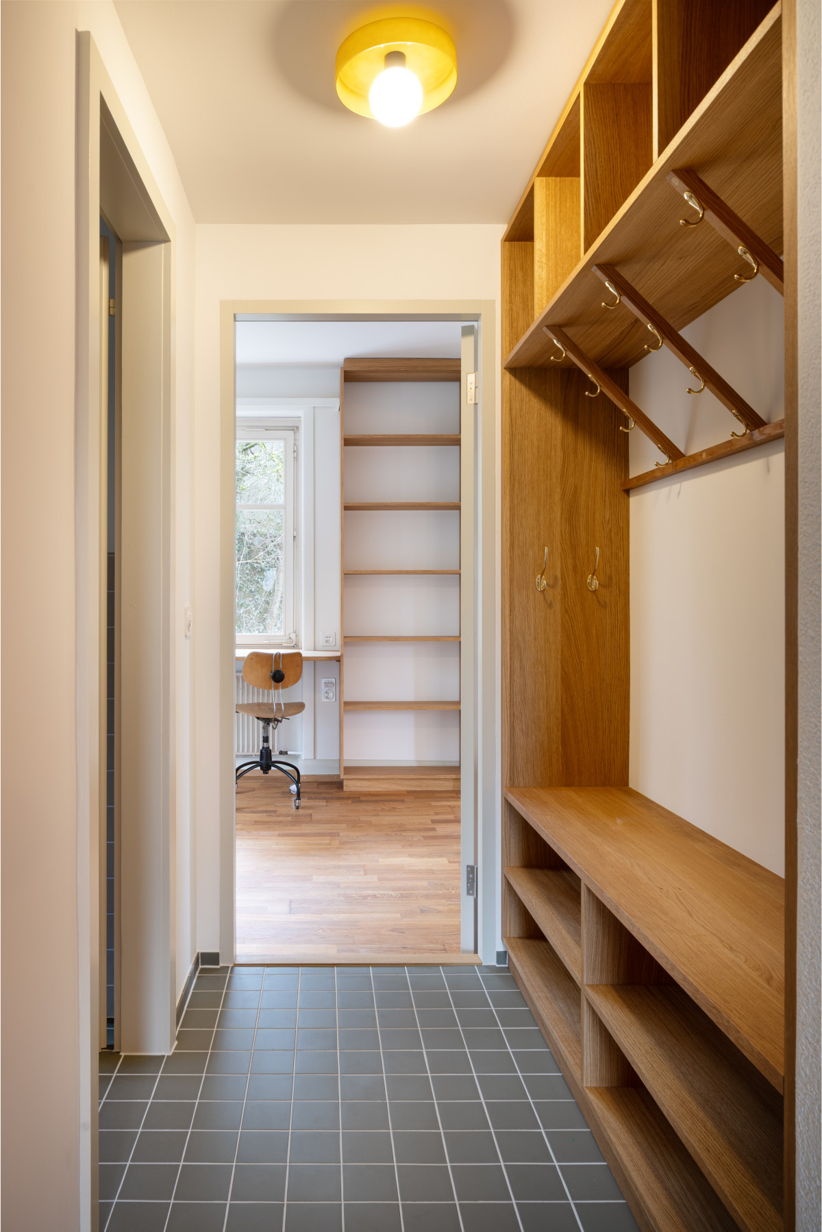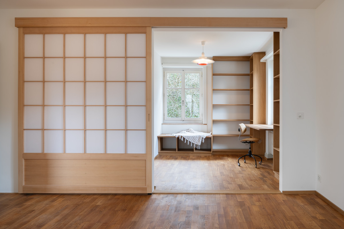 In der ersten Phase des Projekts wird der Innenraum saniert und umgebaut. Im Erdgeschoss entstehen neue Raumbezüge, zwischen der Küche, dem Esszimmer und dem Lesezimmer. Die Haustechnik wird erneuert und die Küche und Bäder umgestaltet. Die Küche orientiert sich neu um eine Kücheninsel, die bis ins Esszimmer ragt. Das Lesezimmer, das als Bibliothek und Büro dient, kann mit einer japanischen Shoji-Tür mit Wohnen verbunden werden. Eine Serie von personalisierten Einbaumöbeln wird im Haus platziert. Sie sind in einem hohen Mass an die Bedürfnisse und Gewohnheiten der neuen Bewohnerschaft angepasst. Die bestehenden Beläge, wie beispielsweise der Eichenparkett, werden aufgefrischt und mit einer Reihe warmer bunter Oberflächen ergänzt. In einer zweiten Phase wird die Gebäudehülle energetisch saniert.